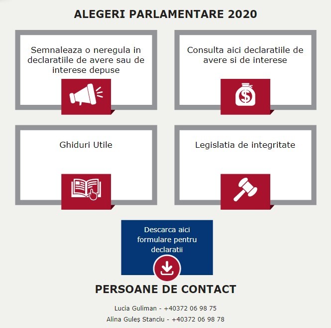 Disponibilă pe pagina de Internet a Agenției la adresa https://www.integritate.eu/Alegeri-Parlamentare-2020, secțiunea grupează mai multe categorii de informații utile: