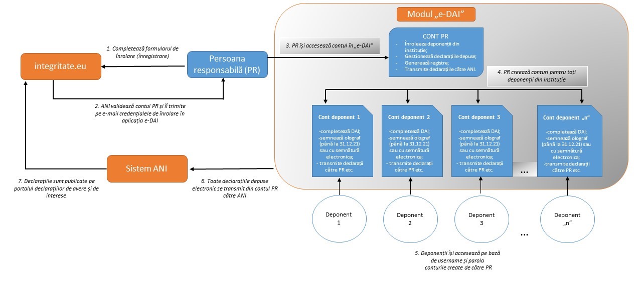 Potrivit procedurii, mecanismul de transmitere la distanță a declarațiilor de avere și de interese prin modulul e-DAI presupune parcurgerea a cinci pași generali: (i) înrolarea persoanei responsabile, (ii) înrolarea deponenților de către persoana responsabilă, (iii) completarea declarațiilor de avere și de interese de către deponenți, (iv) validarea declarațiilor de către persoana responsabilă și (v) transmiterea către ANI a declarațiilor.